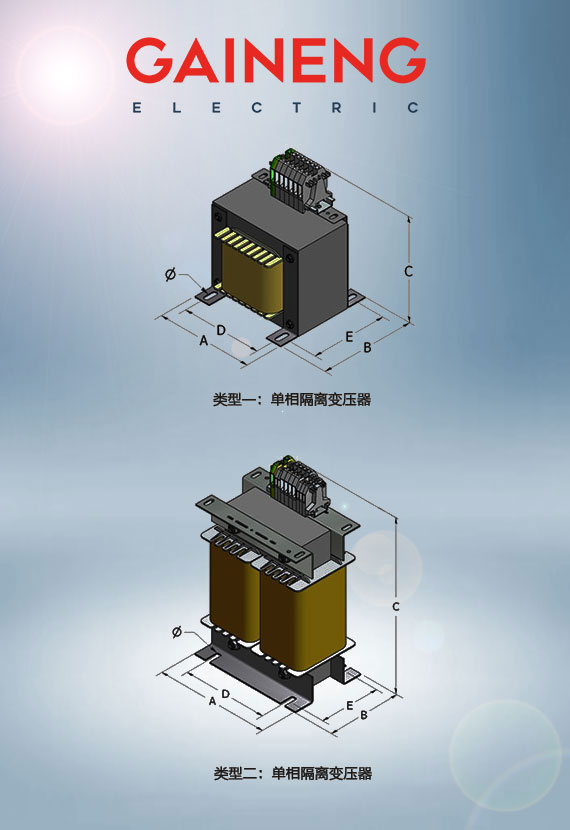 *產品尺寸僅供參考,可依據客戶需求設計生產不同規格型號的單相隔離變壓器。